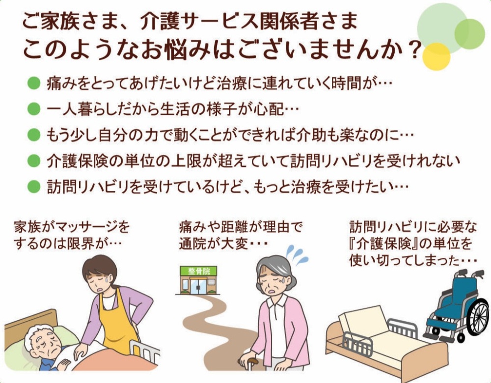 国家資格をもった経験豊富な鍼灸師・マッサージ師が、歩行困難や寝たきりの方などのご自宅や入所されている施設などに訪問させていただき、マッサージや鍼灸治療を行います