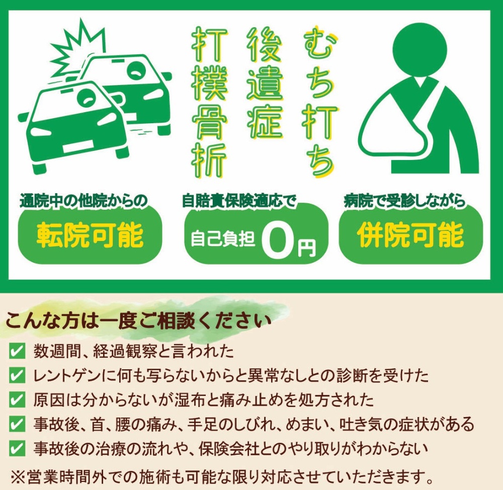 多くの方が、交通事故にあった後は、病院や整形外科を受診されると思いますが、接骨院でも交通事故を起因とするケガの治療が可能で、それぞれの患者様に応じて、病院や整形外科とは異なるアプローチもご提案して参ります。